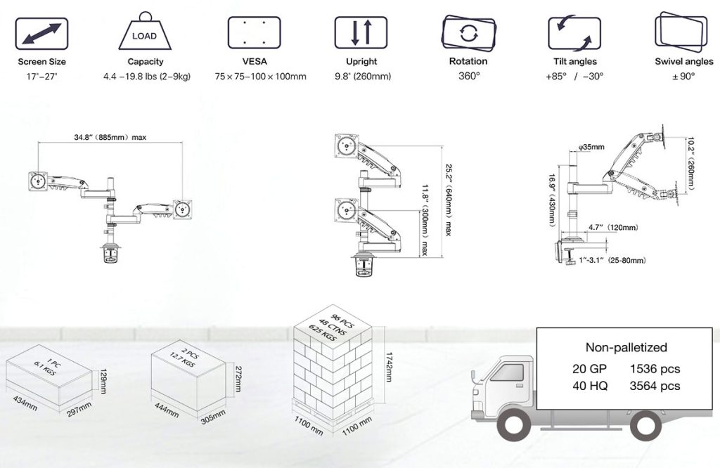 Кронштейн для двух мониторов NB F160 — это современный и функциональный аксессуар для вашего рабочего пространства, который позволяет установить два монитора размером от 17 до 27 дюймов с общей нагрузкой до 18 кг на стол.